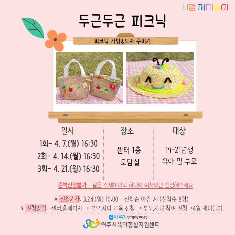 | (19-21³â»ý) Àç¹Ì³îÀÌ 1ȸ [µÎ±ÙµÎ±Ù ÇÇÅ©´Ð] 4.7.(¿ù) 16:30 | |||