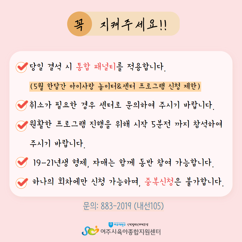 | ±âŸ»çÇ× | - ÁÖÂ÷ÀåÀÌ Çù¼ÒÇÏ¿À´Ï 5ºÐÀü±îÁö µµÂøÇÏ¿© Ȱµ¿ ½Ã°£¿¡ ´ÊÁö ¾Êµµ·Ï ÁÖÀǹٶø´Ï´Ù. - 19-21³â»ý ÇüÁ¦,Àڸе¿¹Ý Âü¿© °¡´ÉÇÕ´Ï´Ù. - ÇÁ·Î±×·¥ ´çÀÏ °á¼® ½Ã ÅëÇÕÆÐ³ÎÆ¼°¡ Àû¿ëµÇ´Ï À¯ÀÇÇØÁÖ¼¼¿ä (25³â 5¿ù ÇÑ´Þ °£ ¾ÆÀÌ»ç¶û ³îÀÌÅÍ& ¼¾ÅÍ ÇÁ·Î±×·¥ ½ÅûÁ¦ÇÑ) - °á¼® ½Ã Áõºù¼·ù¸¦ ²À ÁöÂüÇØ ÁÖ¼Å¾ß Çϸç Ãë¼Ò³ª °á¼®½Ã ´ã´çÀÚ¿¡°Ô ¿¬¶ôÁֽñ⠹ٶø´Ï´Ù. - ´ë±âÀÚ´Â ½Åû ¼øÀ¸·Î ¿¬¶ôµå¸®¸ç ºÎÀçÁß ½Ã ´ÙÀ½ ´ë±âÀÚ¿¡°Ô ¿¬¶ôµå¸³´Ï´Ù. . - 1,2,3ȸ °°Àº ÁÖÁ¦·Î ÁøÇàµÇ¿À´Ï Áߺ¹ ½ÅûÀº ºÒ°¡ÇÕ´Ï´Ù. |