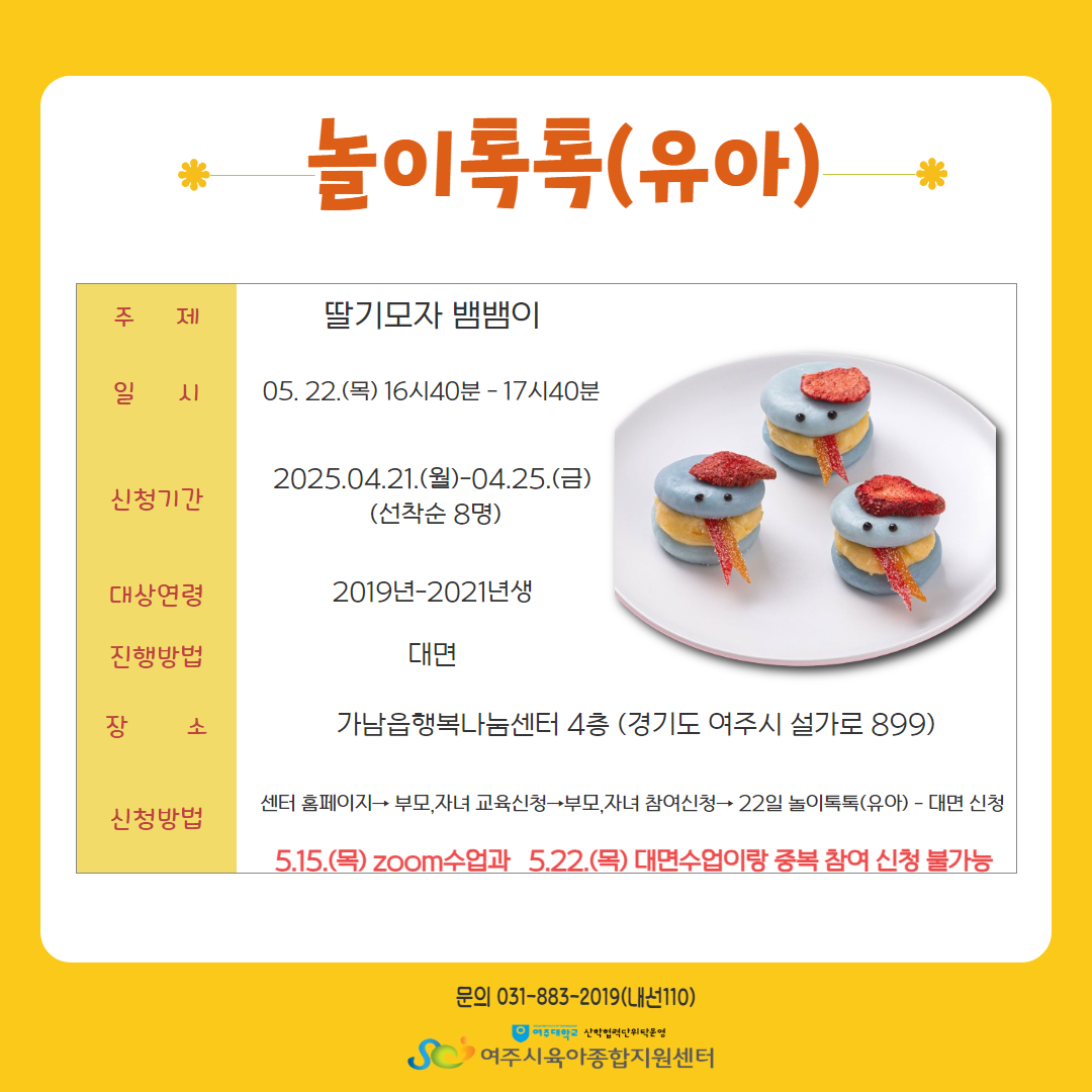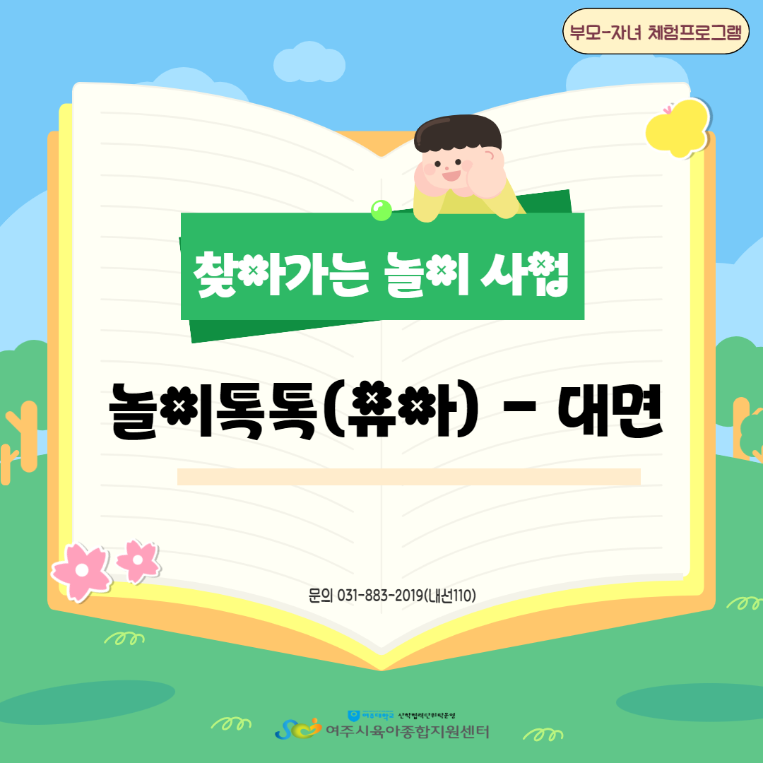 | (19-21³â»ý) [´ë¸é] ³îÀÌÅåÅå(À¯¾Æ) µþ±â¸ðÀÚ¹ì¹ìÀÌ 5.22.(¸ñ)16:40-17:40 | |||