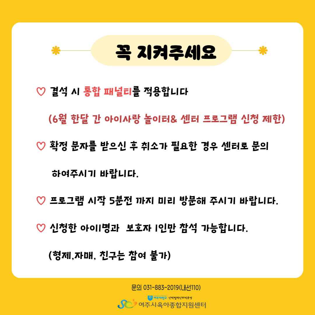 | ±âŸ»çÇ× | - ÁÖÂ÷ÀåÀÌ Çù¼ÒÇÏ¿À´Ï 5ºÐÀü±îÁö µµÂøÇÏ¿© Ȱµ¿ ½Ã°£¿¡ ´ÊÁö ¾Êµµ·Ï ÁÖÀǹٶø´Ï´Ù. - º» ÇÁ·Î±×·¥Àº ½ÅûÇÑ ¾ÆÀÌ1¸í°ú º¸È£ÀÚ 1Àθ¸ Âü¼®°¡´ÉÇÕ´Ï´Ù.(ÇüÁ¦,ÀڸŠÂü¿©ºÒ°¡) - ÇÁ·Î±×·¥ ´çÀÏ °á¼® ½Ã ÅëÇÕÆÐ³ÎÆ¼°¡ Àû¿ëµÇ´Ï À¯ÀÇÇØÁÖ¼¼¿ä (25³â 6¿ù ÇÑ´Þ °£ ¾ÆÀÌ»ç¶û ³îÀÌÅÍ& ¼¾ÅÍ ÇÁ·Î±×·¥ ½ÅûÁ¦ÇÑ) - °á¼® ½Ã Áõºù¼·ù¸¦ ²À ÁöÂüÇØ ÁÖ¼Å¾ß Çϸç Ãë¼Ò³ª °á¼®½Ã ´ã´çÀÚ¿¡°Ô ¿¬¶ôÁֽñ⠹ٶø´Ï´Ù. - ´ë±âÀÚ´Â ½Åû ¼øÀ¸·Î ¿¬¶ôµå¸®¸ç ºÎÀçÁß ½Ã ´ÙÀ½ ´ë±âÀÚ¿¡°Ô ¿¬¶ôµå¸³´Ï´Ù. - °¡³²Çູ³ª´®¼¾ÅÍ 4Ãþ ´Ù¸ñÀû½Ç¿¡¼ ÁøÇàµË´Ï´Ù. |
