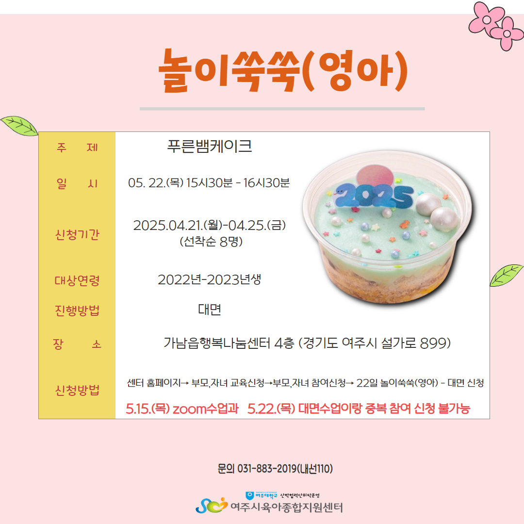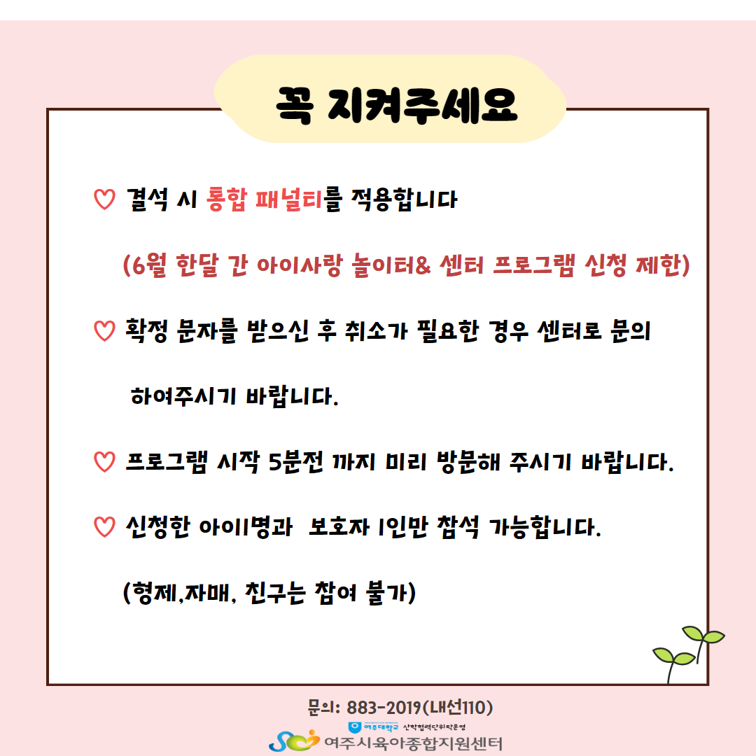 | ±âŸ»çÇ× | - ÁÖÂ÷ÀåÀÌ Çù¼ÒÇÏ¿À´Ï 5ºÐÀü±îÁö µµÂøÇÏ¿© Ȱµ¿ ½Ã°£¿¡ ´ÊÁö ¾Êµµ·Ï ÁÖÀǹٶø´Ï´Ù. - º» ÇÁ·Î±×·¥Àº ½ÅûÇÑ ¾ÆÀÌ1¸í°ú º¸È£ÀÚ 1Àθ¸ Âü¼®°¡´ÉÇÕ´Ï´Ù.(ÇüÁ¦,ÀڸŠÂü¿©ºÒ°¡) - ÇÁ·Î±×·¥ ´çÀÏ °á¼® ½Ã ÅëÇÕÆÐ³ÎÆ¼°¡ Àû¿ëµÇ´Ï À¯ÀÇÇØÁÖ¼¼¿ä (25³â 6¿ù ÇÑ´Þ °£ ¾ÆÀÌ»ç¶û ³îÀÌÅÍ& ¼¾ÅÍ ÇÁ·Î±×·¥ ½ÅûÁ¦ÇÑ) - °á¼® ½Ã Áõºù¼·ù¸¦ ²À ÁöÂüÇØ ÁÖ¼Å¾ß Çϸç Ãë¼Ò³ª °á¼®½Ã ´ã´çÀÚ¿¡°Ô ¿¬¶ôÁֽñ⠹ٶø´Ï´Ù. - ´ë±âÀÚ´Â ½Åû ¼øÀ¸·Î ¿¬¶ôµå¸®¸ç ºÎÀçÁß ½Ã ´ÙÀ½ ´ë±âÀÚ¿¡°Ô ¿¬¶ôµå¸³´Ï´Ù. - °¡³²Çູ³ª´®¼¾ÅÍ 4Ãþ ´Ù¸ñÀû½Ç¿¡¼ ÁøÇàµË´Ï´Ù. - 5¿ù15ÀÏ(¸ñ)°ú 5¿ù 22ÀÏ(¸ñ) Áߺ¹ ½Åû ºÒ°¡´ÉÇÕ´Ï´Ù. |