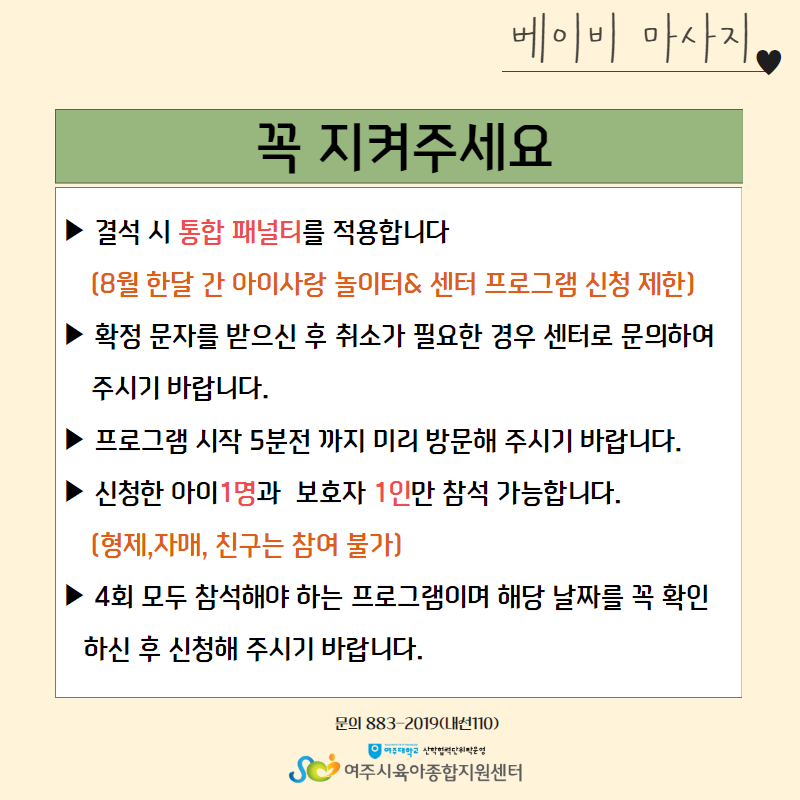 | ±âŸ»çÇ× | - ÁÖÂ÷ÀåÀÌ Çù¼ÒÇÏ¿À´Ï 5ºÐÀü±îÁö µµÂøÇÏ¿© Ȱµ¿ ½Ã°£¿¡ ´ÊÁö ¾Êµµ·Ï ÁÖÀǹٶø´Ï´Ù. - º» ÇÁ·Î±×·¥Àº ½ÅûÇÑ ¾ÆÀÌ1¸í°ú º¸È£ÀÚ 1Àθ¸ Âü¼®°¡´ÉÇÕ´Ï´Ù.(ÇüÁ¦,ÀڸŠÂü¿©ºÒ°¡) - ÇÁ·Î±×·¥ ´çÀÏ °á¼® ½Ã ÅëÇÕÆÐ³ÎÆ¼°¡ Àû¿ëµÇ´Ï À¯ÀÇÇØÁÖ¼¼¿ä (25³â 8¿ù ÇÑ´Þ °£ ¾ÆÀÌ»ç¶û ³îÀÌÅÍ& ¼¾ÅÍ ÇÁ·Î±×·¥ ½ÅûÁ¦ÇÑ) - °á¼® ½Ã Áõºù¼·ù¸¦ ²À ÁöÂüÇØ ÁÖ¼Å¾ß Çϸç Ãë¼Ò³ª °á¼®½Ã ´ã´çÀÚ¿¡°Ô ¿¬¶ôÁֽñ⠹ٶø´Ï´Ù. - ´ë±âÀÚ´Â ½Åû ¼øÀ¸·Î ¿¬¶ôµå¸®¸ç ºÎÀçÁß ½Ã ´ÙÀ½ ´ë±âÀÚ¿¡°Ô ¿¬¶ôµå¸³´Ï´Ù. |