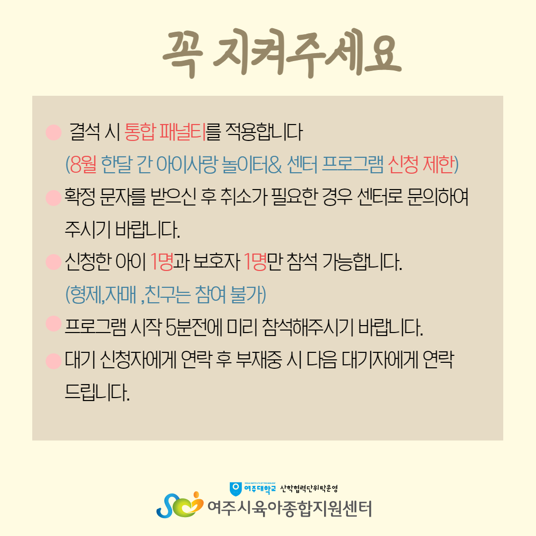 | ±âŸ»çÇ× | - ÁÖÂ÷ÀåÀÌ Çù¼ÒÇÏ¿À´Ï 5ºÐÀü±îÁö µµÂøÇÏ¿© Ȱµ¿ ½Ã°£¿¡ ´ÊÁö ¾Êµµ·Ï ÁÖÀǹٶø´Ï´Ù. - º» ÇÁ·Î±×·¥Àº ½ÅûÇÑ ¾ÆÀÌ1¸í°ú º¸È£ÀÚ 1Àθ¸ Âü¼®°¡´ÉÇÕ´Ï´Ù.(ÇüÁ¦,ÀڸŠÂü¿©ºÒ°¡) - ÇÁ·Î±×·¥ ´çÀÏ °á¼® ½Ã ÅëÇÕÆÐ³ÎÆ¼°¡ Àû¿ëµÇ´Ï À¯ÀÇÇØÁÖ¼¼¿ä (25³â 8¿ù ÇÑ´Þ °£ ¾ÆÀÌ»ç¶û ³îÀÌÅÍ& ¼¾ÅÍ ÇÁ·Î±×·¥ ½ÅûÁ¦ÇÑ) - °á¼® ½Ã Áõºù¼·ù¸¦ ²À ÁöÂüÇØ ÁÖ¼Å¾ß Çϸç Ãë¼Ò³ª °á¼®½Ã ´ã´çÀÚ¿¡°Ô ¿¬¶ôÁֽñ⠹ٶø´Ï´Ù. - ´ë±âÀÚ´Â ½Åû ¼øÀ¸·Î ¿¬¶ôµå¸®¸ç ºÎÀçÁß ½Ã ´ÙÀ½ ´ë±âÀÚ¿¡°Ô ¿¬¶ôµå¸³´Ï´Ù. - 1,2ȸ±â ¸ðµÎ Âü¼®ÇÏ¼Å¾ß ÇÕ´Ï´Ù. |