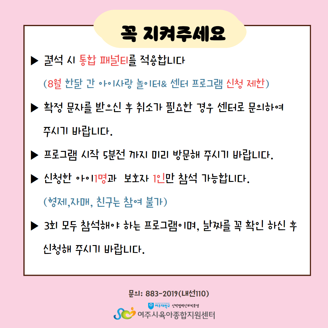 | ±âŸ»çÇ× | - ÁÖÂ÷ÀåÀÌ Çù¼ÒÇÏ¿À´Ï 5ºÐÀü±îÁö µµÂøÇÏ¿© Ȱµ¿ ½Ã°£¿¡ ´ÊÁö ¾Êµµ·Ï ÁÖÀǹٶø´Ï´Ù. - º» ÇÁ·Î±×·¥Àº ½ÅûÇÑ ¾ÆÀÌ1¸í°ú º¸È£ÀÚ 1Àθ¸ Âü¼®°¡´ÉÇÕ´Ï´Ù.(ÇüÁ¦,ÀڸŠÂü¿©ºÒ°¡) - ÇÁ·Î±×·¥ ´çÀÏ °á¼® ½Ã ÅëÇÕÆÐ³ÎÆ¼°¡ Àû¿ëµÇ´Ï À¯ÀÇÇØÁÖ¼¼¿ä (25³â 8¿ù ÇÑ´Þ °£ ¾ÆÀÌ»ç¶û ³îÀÌÅÍ& ¼¾ÅÍ ÇÁ·Î±×·¥ ½ÅûÁ¦ÇÑ) - °á¼® ½Ã Áõºù¼·ù¸¦ ²À ÁöÂüÇØ ÁÖ¼Å¾ß Çϸç Ãë¼Ò³ª °á¼®½Ã ´ã´çÀÚ¿¡°Ô ¿¬¶ôÁֽñ⠹ٶø´Ï´Ù. - ´ë±âÀÚ´Â ½Åû ¼øÀ¸·Î ¿¬¶ôµå¸®¸ç ºÎÀçÁß ½Ã ´ÙÀ½ ´ë±âÀÚ¿¡°Ô ¿¬¶ôµå¸³´Ï´Ù. - ´Ùȸ±â ÇÁ·Î±×·¥À¸·Î ÀÏÁ¤ È®ÀÎ ÈÄ Âü¿©°¡ ¸ðµÎ °¡´ÉÇϽаæ¿ì¿¡¸¸ ½ÅÃ»ÇØÁֽñ⠹ٶø´Ï´Ù. |