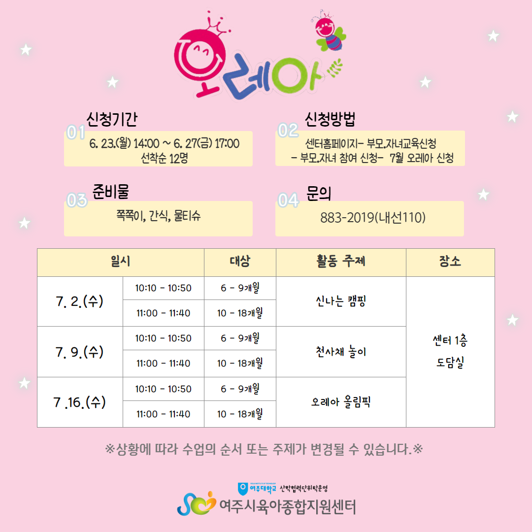| ±âŸ»çÇ× | - ÁÖÂ÷ÀåÀÌ Çù¼ÒÇÏ¿À´Ï 5ºÐÀü±îÁö µµÂøÇÏ¿© Ȱµ¿ ½Ã°£¿¡ ´ÊÁö ¾Êµµ·Ï ÁÖÀǹٶø´Ï´Ù. - º» ÇÁ·Î±×·¥Àº ½ÅûÇÑ ¾ÆÀÌ1¸í°ú º¸È£ÀÚ 1Àθ¸ Âü¼®°¡´ÉÇÕ´Ï´Ù.(ÇüÁ¦,ÀڸŠÂü¿©ºÒ°¡) - ÇÁ·Î±×·¥ ´çÀÏ °á¼® ½Ã ÅëÇÕÆÐ³ÎÆ¼°¡ Àû¿ëµÇ´Ï À¯ÀÇÇØÁÖ¼¼¿ä (25³â 8¿ù ÇÑ´Þ °£ ¾ÆÀÌ»ç¶û ³îÀÌÅÍ& ¼¾ÅÍ ÇÁ·Î±×·¥ ½ÅûÁ¦ÇÑ) - °á¼® ½Ã Áõºù¼·ù¸¦ ²À ÁöÂüÇØ ÁÖ¼Å¾ß Çϸç Ãë¼Ò³ª °á¼®½Ã ´ã´çÀÚ¿¡°Ô ¿¬¶ôÁֽñ⠹ٶø´Ï´Ù. - ´ë±âÀÚ´Â ½Åû ¼øÀ¸·Î ¿¬¶ôµå¸®¸ç ºÎÀçÁß ½Ã ´ÙÀ½ ´ë±âÀÚ¿¡°Ô ¿¬¶ôµå¸³´Ï´Ù. - ´Ùȸ±â ÇÁ·Î±×·¥À¸·Î ÀÏÁ¤ È®ÀÎ ÈÄ Âü¿©°¡ ¸ðµÎ °¡´ÉÇϽаæ¿ì¿¡¸¸ ½ÅÃ»ÇØÁֽñ⠹ٶø´Ï´Ù. |
