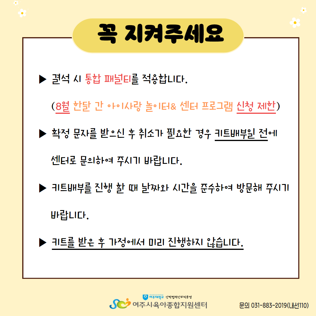 | ±âŸ»çÇ× | - Ãë¼Ò ½Ã ³îÀÌŰƮ ¹èºÎÀÏ Àü¿¡ ´ã´çÀÚ¿¡°Ô ¿¬¶ôÁֽñ⠹ٶø´Ï´Ù. - ÇÁ·Î±×·¥ ´çÀÏ °á¼® ½Ã ÅëÇÕÆÐ³ÎÆ¼°¡ Àû¿ëµÇ´Ï À¯ÀÇÇØÁÖ¼¼¿ä (25³â 8¿ù ÇÑ´Þ °£ ¾ÆÀÌ»ç¶û ³îÀÌÅÍ& ¼¾ÅÍ ÇÁ·Î±×·¥ ½ÅûÁ¦ÇÑ) - ´ë±âÀÚ´Â ½Åû ¼øÀ¸·Î ¿¬¶ôµå¸®¸ç ºÎÀçÁß ½Ã ´ÙÀ½ ´ë±âÀÚ¿¡°Ô ¿¬¶ôµå¸³´Ï´Ù. - ŰƮ¹èºÎÀÏ[7.10.(¸ñ) 15:00-18:00] ½Ã°£À» ÁؼöÇÏ¿© ¹æ¹®ÇØÁֽñ⠹ٶø´Ï´Ù. - ŰƮ¹èºÎ³¯Â¥¿Í ZOOM ¼ö¾÷ ³¯Â¥¸¦ ²À! È®ÀÎÇØÁÖ¼¼¿ä. - ´ë±âÀÚ´Â ½Åû ¼øÀ¸·Î ¿¬¶ôµå¸®¸ç ºÎÀçÁß ½Ã ´ÙÀ½ ´ë±âÀÚ¿¡°Ô ¿¬¶ôµå¸³´Ï´Ù. -ŰƮ ¹ÞÀº ÈÄ °¡Á¤¿¡¼ ¹Ì¸® ÁøÇàÇÏÁö ¾Ê½À´Ï´Ù. - 7¿ù11ÀÏ(±Ý)°ú 7¿ù 24ÀÏ(¸ñ) Áߺ¹ ½Åû ºÒ°¡´ÉÇÕ´Ï´Ù. |