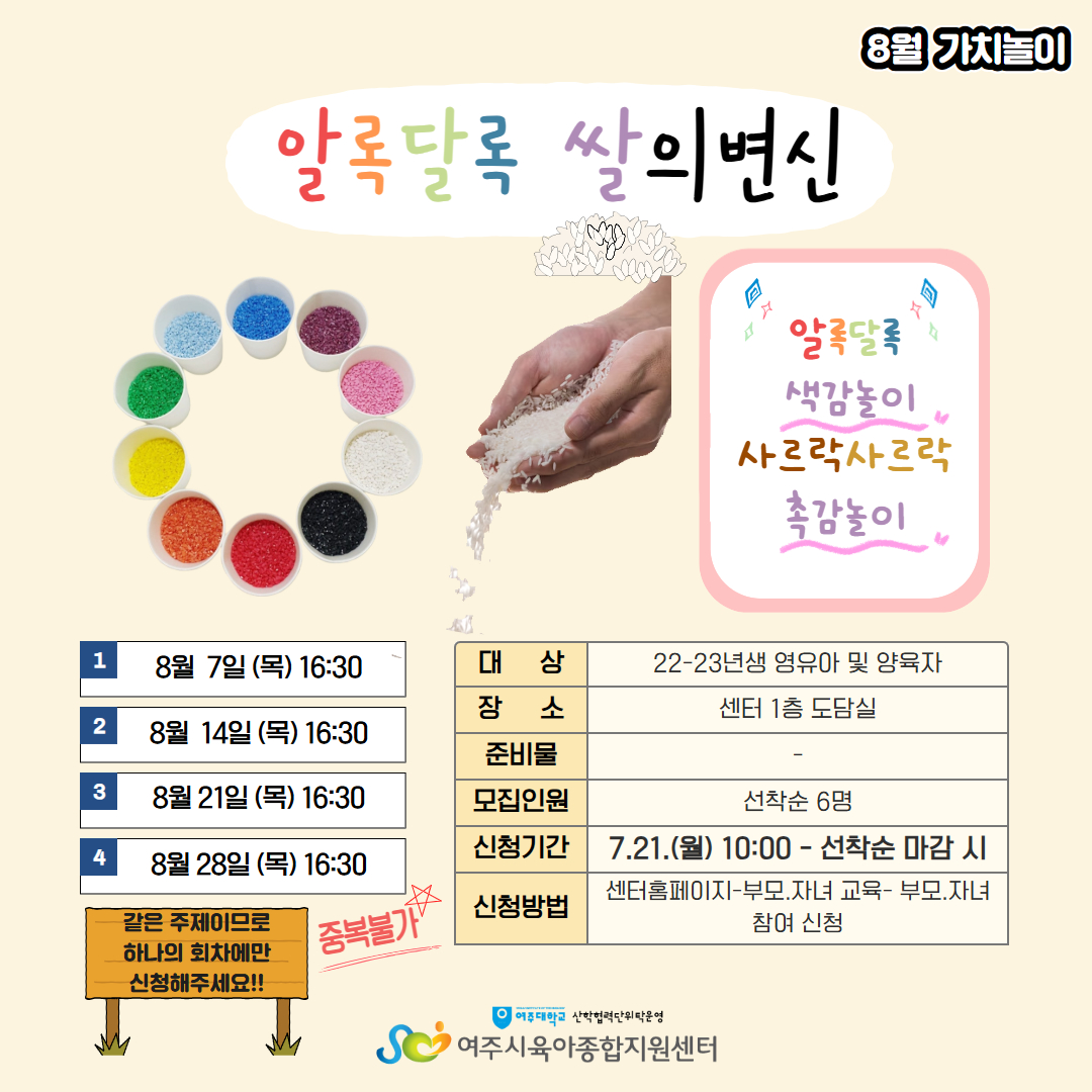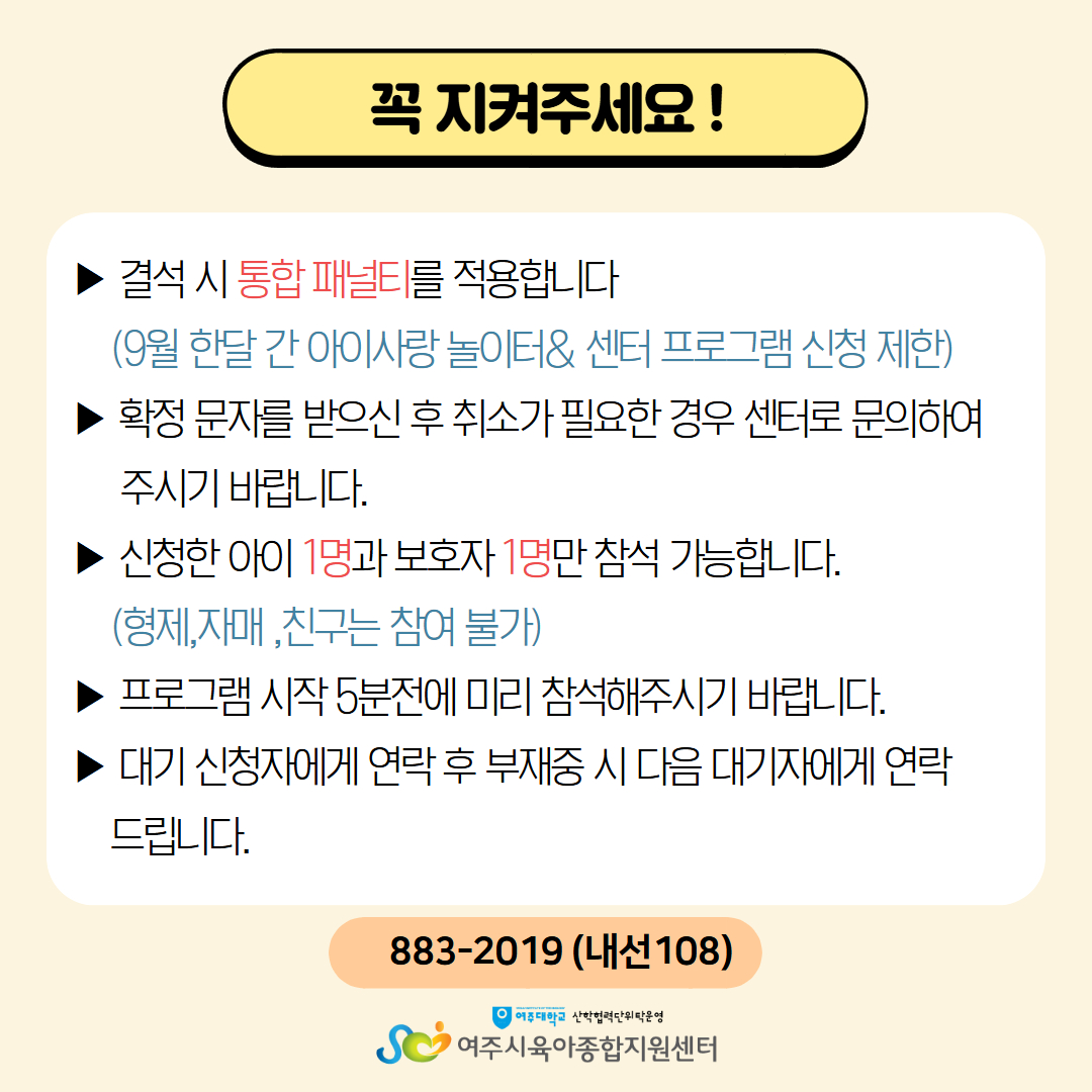 | ±âŸ»çÇ× | - ÁÖÂ÷ÀåÀÌ Çù¼ÒÇÏ¿À´Ï 5ºÐÀü±îÁö µµÂøÇÏ¿© Ȱµ¿ ½Ã°£¿¡ ´ÊÁö ¾Êµµ·Ï ÁÖÀǹٶø´Ï´Ù. - º» ÇÁ·Î±×·¥Àº ½ÅûÇÑ ¾ÆÀÌ1¸í°ú º¸È£ÀÚ 1Àθ¸ Âü¼®°¡´ÉÇÕ´Ï´Ù.(ÇüÁ¦,ÀڸŠÂü¿©ºÒ°¡) - ÇÁ·Î±×·¥ ´çÀÏ °á¼® ½Ã ÅëÇÕÆÐ³ÎÆ¼°¡ Àû¿ëµÇ´Ï À¯ÀÇÇØÁÖ¼¼¿ä (25³â 9¿ù ÇÑ´Þ °£ ¾ÆÀÌ»ç¶û ³îÀÌÅÍ& ¼¾ÅÍ ÇÁ·Î±×·¥ ½ÅûÁ¦ÇÑ) - °á¼® ½Ã Áõºù¼·ù¸¦ ²À ÁöÂüÇØ ÁÖ¼Å¾ß Çϸç Ãë¼Ò³ª °á¼®½Ã ´ã´çÀÚ¿¡°Ô ¿¬¶ôÁֽñ⠹ٶø´Ï´Ù. - ´ë±âÀÚ´Â ½Åû ¼øÀ¸·Î ¿¬¶ôµå¸®¸ç ºÎÀçÁß ½Ã ´ÙÀ½ ´ë±âÀÚ¿¡°Ô ¿¬¶ôµå¸³´Ï´Ù. - 1,2,3,4ȸ °°Àº ÁÖÁ¦·Î ÁøÇàµÇ¿À´Ï Áߺ¹ ½ÅûÀº ºÒ°¡ÇÕ´Ï´Ù. |