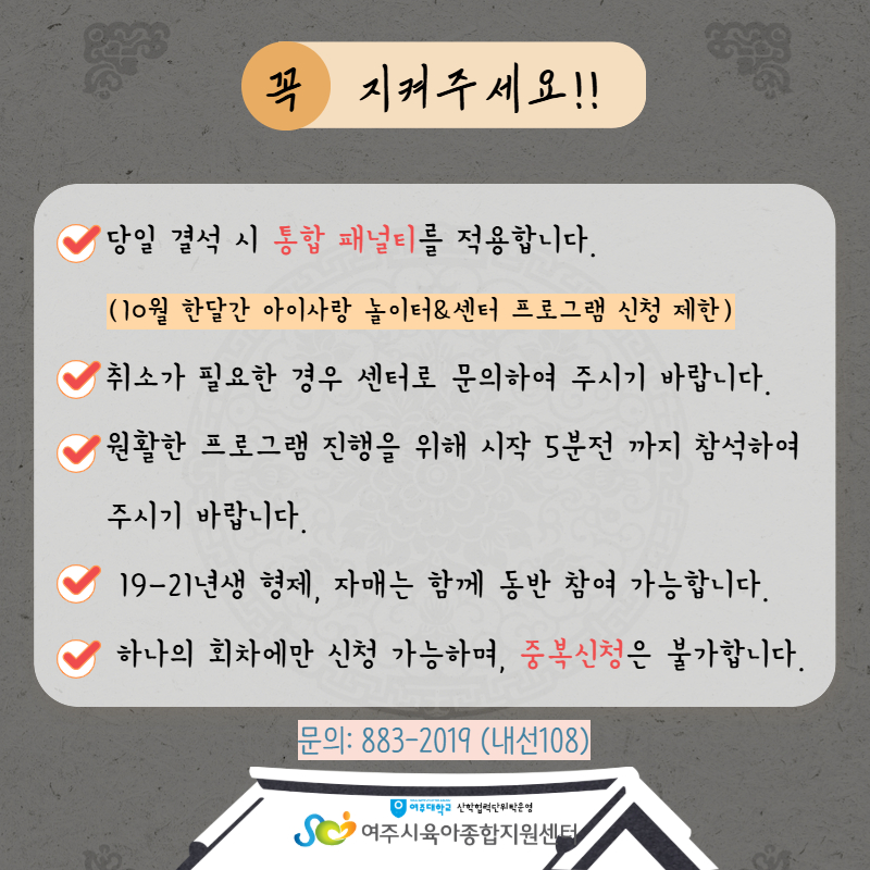 | ±âŸ»çÇ× | - ÁÖÂ÷ÀåÀÌ Çù¼ÒÇÏ¿À´Ï 5ºÐÀü±îÁö µµÂøÇÏ¿© Ȱµ¿ ½Ã°£¿¡ ´ÊÁö ¾Êµµ·Ï ÁÖÀǹٶø´Ï´Ù. - º» ÇÁ·Î±×·¥Àº 19-21³â»ý ÇüÁ¦,ÀڸŰ¡ µ¿¹Ý Âü¿© °¡´ÉÇÕ´Ï´Ù. - ÇÁ·Î±×·¥ ´çÀÏ °á¼® ½Ã ÅëÇÕÆÐ³ÎÆ¼°¡ Àû¿ëµÇ´Ï À¯ÀÇÇØÁÖ¼¼¿ä (25³â 10¿ù ÇÑ´Þ °£ ¾ÆÀÌ»ç¶û ³îÀÌÅÍ& ¼¾ÅÍ ÇÁ·Î±×·¥ ½ÅûÁ¦ÇÑ) - °á¼® ½Ã Áõºù¼·ù¸¦ ²À ÁöÂüÇØ ÁÖ¼Å¾ß Çϸç Ãë¼Ò³ª °á¼®½Ã ´ã´çÀÚ¿¡°Ô ¿¬¶ôÁֽñ⠹ٶø´Ï´Ù. - ´ë±âÀÚ´Â ½Åû ¼øÀ¸·Î ¿¬¶ôµå¸®¸ç ºÎÀçÁß ½Ã ´ÙÀ½ ´ë±âÀÚ¿¡°Ô ¿¬¶ôµå¸³´Ï´Ù. - 1,2,3ȸ °°Àº ÁÖÁ¦·Î ÁøÇàµÇ¿À´Ï Áߺ¹ ½ÅûÀº ºÒ°¡ÇÕ´Ï´Ù. |