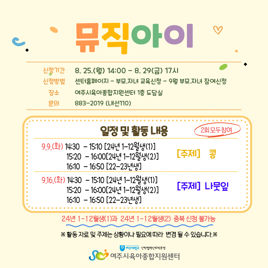 | ±âŸ»çÇ× | - ÁÖÂ÷ÀåÀÌ Çù¼ÒÇÏ¿À´Ï 5ºÐÀü±îÁö µµÂøÇÏ¿© Ȱµ¿ ½Ã°£¿¡ ´ÊÁö ¾Êµµ·Ï ÁÖÀǹٶø´Ï´Ù. - º» ÇÁ·Î±×·¥Àº ½ÅûÇÑ ¾ÆÀÌ1¸í°ú º¸È£ÀÚ 1Àθ¸ Âü¼®°¡´ÉÇÕ´Ï´Ù.(ÇüÁ¦,ÀڸŠÂü¿©ºÒ°¡) - ÇÁ·Î±×·¥ ´çÀÏ °á¼® ½Ã ÅëÇÕÆÐ³ÎÆ¼°¡ Àû¿ëµÇ´Ï À¯ÀÇÇØÁÖ¼¼¿ä (25³â 10¿ù ÇÑ´Þ °£ ¾ÆÀÌ»ç¶û ³îÀÌÅÍ& ¼¾ÅÍ ÇÁ·Î±×·¥ ½ÅûÁ¦ÇÑ) - °á¼® ½Ã Áõºù¼·ù¸¦ ²À ÁöÂüÇØ ÁÖ¼Å¾ß Çϸç Ãë¼Ò³ª °á¼®½Ã ´ã´çÀÚ¿¡°Ô ¿¬¶ôÁֽñ⠹ٶø´Ï´Ù. - ´ë±âÀÚ´Â ½Åû ¼øÀ¸·Î ¿¬¶ôµå¸®¸ç ºÎÀçÁß ½Ã ´ÙÀ½ ´ë±âÀÚ¿¡°Ô ¿¬¶ôµå¸³´Ï´Ù. - 1,2ȸ±â ¸ðµÎ Âü¼®ÇÏ¼Å¾ß ÇÕ´Ï´Ù. |
