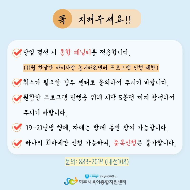 | ±âŸ»çÇ× | - ÁÖÂ÷ÀåÀÌ Çù¼ÒÇÏ¿À´Ï 5ºÐÀü±îÁö µµÂøÇÏ¿© Ȱµ¿ ½Ã°£¿¡ ´ÊÁö ¾Êµµ·Ï ÁÖÀǹٶø´Ï´Ù. - º» ÇÁ·Î±×·¥Àº 19-21³â»ý ÇüÁ¦,ÀڸŰ¡ µ¿¹Ý Âü¿© °¡´ÉÇÕ´Ï´Ù. - ÇÁ·Î±×·¥ ´çÀÏ °á¼® ½Ã ÅëÇÕÆÐ³ÎÆ¼°¡ Àû¿ëµÇ´Ï À¯ÀÇÇØÁÖ¼¼¿ä (25³â 11¿ù ÇÑ´Þ °£ ¾ÆÀÌ»ç¶û ³îÀÌÅÍ& ¼¾ÅÍ ÇÁ·Î±×·¥ ½ÅûÁ¦ÇÑ) - °á¼® ½Ã Áõºù¼·ù¸¦ ²À ÁöÂüÇØ ÁÖ¼Å¾ß Çϸç Ãë¼Ò³ª °á¼®½Ã ´ã´çÀÚ¿¡°Ô ¿¬¶ôÁֽñ⠹ٶø´Ï´Ù. - ´ë±âÀÚ´Â ½Åû ¼øÀ¸·Î ¿¬¶ôµå¸®¸ç ºÎÀçÁß ½Ã ´ÙÀ½ ´ë±âÀÚ¿¡°Ô ¿¬¶ôµå¸³´Ï´Ù. - 1,2,3ȸ °°Àº ÁÖÁ¦·Î ÁøÇàµÇ¿À´Ï Áߺ¹ ½ÅûÀº ºÒ°¡ÇÕ´Ï´Ù. |