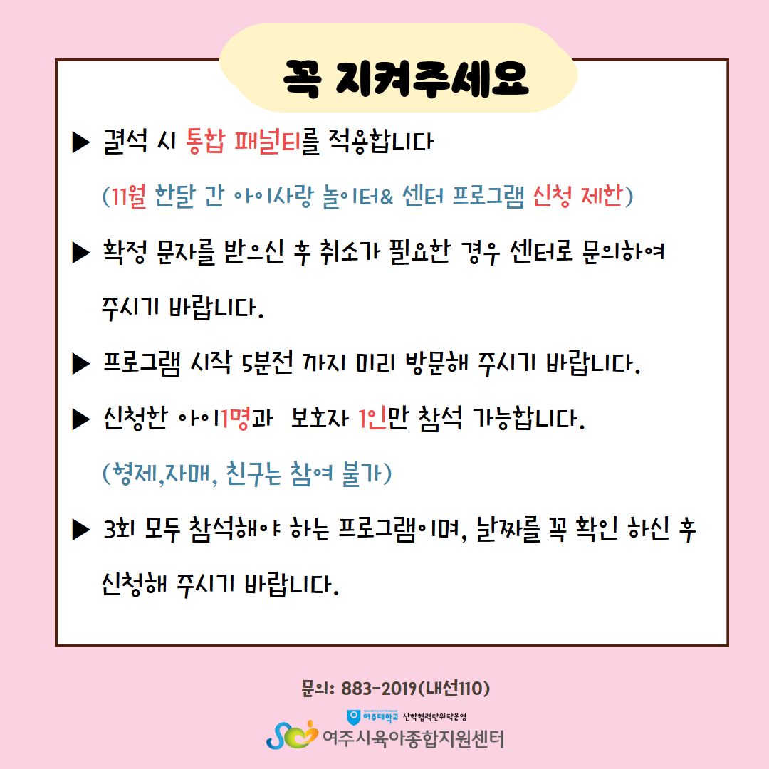 | ±âŸ»çÇ× | - ÁÖÂ÷ÀåÀÌ Çù¼ÒÇÏ¿À´Ï 5ºÐÀü±îÁö µµÂøÇÏ¿© Ȱµ¿ ½Ã°£¿¡ ´ÊÁö ¾Êµµ·Ï ÁÖÀǹٶø´Ï´Ù. (¼¾ÅÍ ¿· °Ç¹° °ø¿ëÁÖÂ÷Àå 1½Ã°£ ¹«·á ÁøÇàÀ̹ǷΠÁÖÂ÷ÀåÀÌ Çù¼ÒÇÒ °æ¿ì ÀÌ¿ëÇϽñ⠹ٶø´Ï´Ù.) - º» ÇÁ·Î±×·¥Àº ½ÅûÇÑ ¾ÆÀÌ1¸í°ú º¸È£ÀÚ 1Àθ¸ Âü¼®°¡´ÉÇÕ´Ï´Ù.(ÇüÁ¦,ÀڸŠÂü¿©ºÒ°¡) - ÇÁ·Î±×·¥ ´çÀÏ °á¼® ½Ã ÅëÇÕÆÐ³ÎÆ¼°¡ Àû¿ëµÇ´Ï À¯ÀÇÇØÁÖ¼¼¿ä (25³â 11¿ù ÇÑ´Þ °£ ¾ÆÀÌ»ç¶û ³îÀÌÅÍ& ¼¾ÅÍ ÇÁ·Î±×·¥ ½ÅûÁ¦ÇÑ) - °á¼® ½Ã Áõºù¼·ù¸¦ ²À ÁöÂüÇØ ÁÖ¼Å¾ß Çϸç Ãë¼Ò³ª °á¼®½Ã ´ã´çÀÚ¿¡°Ô ¿¬¶ôÁֽñ⠹ٶø´Ï´Ù. - ´ë±âÀÚ´Â ½Åû ¼øÀ¸·Î ¿¬¶ôµå¸®¸ç ºÎÀçÁß ½Ã ´ÙÀ½ ´ë±âÀÚ¿¡°Ô ¿¬¶ôµå¸³´Ï´Ù. - ´Ùȸ±â ÇÁ·Î±×·¥À¸·Î ÀÏÁ¤ È®ÀÎ ÈÄ Âü¿©°¡ ¸ðµÎ °¡´ÉÇϽаæ¿ì¿¡¸¸ ½ÅÃ»ÇØÁֽñ⠹ٶø´Ï´Ù. |