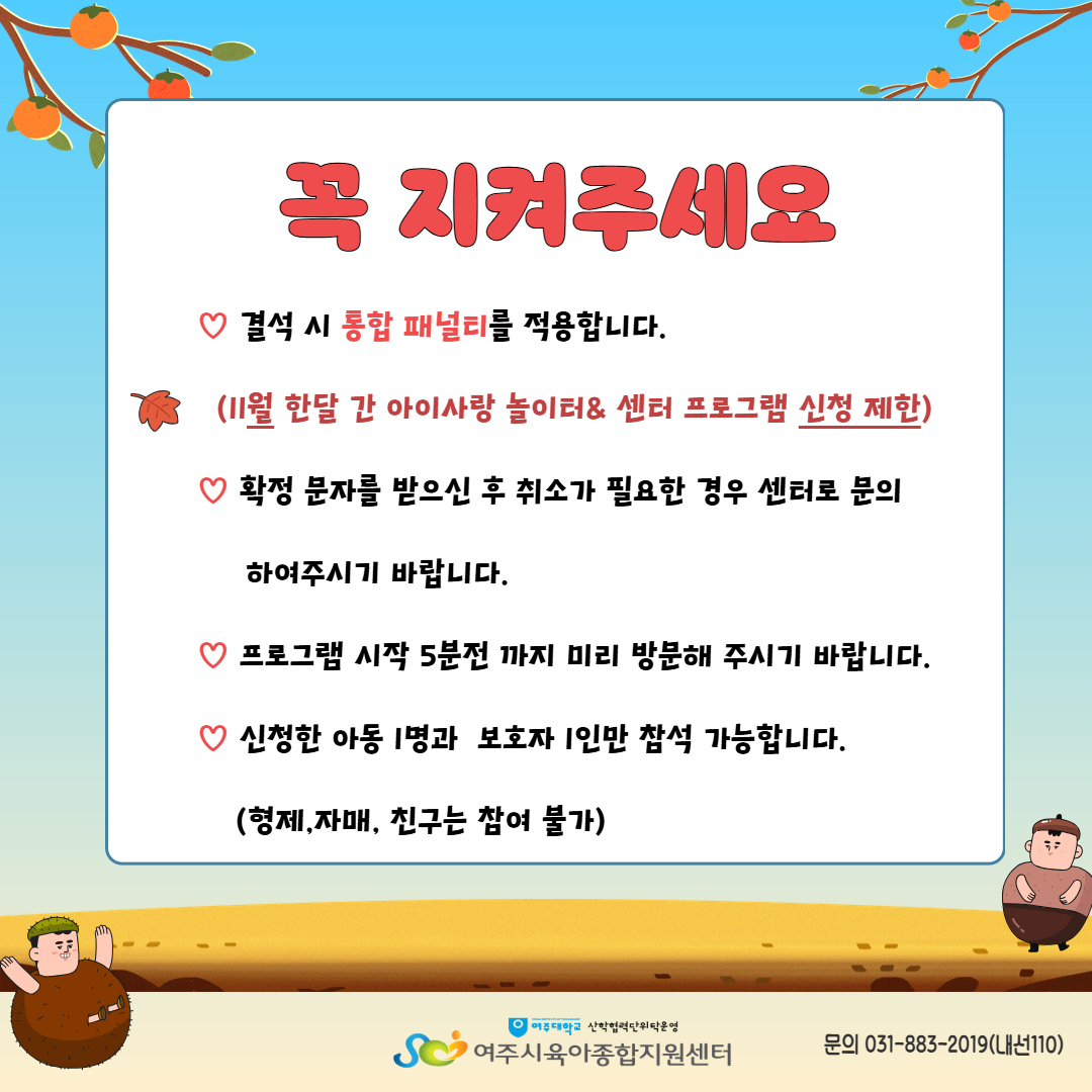 | ±âŸ»çÇ× | - ÁÖÂ÷ÀåÀÌ Çù¼ÒÇÏ¿À´Ï 5ºÐÀü±îÁö µµÂøÇÏ¿© Ȱµ¿ ½Ã°£¿¡ ´ÊÁö ¾Êµµ·Ï ÁÖÀǹٶø´Ï´Ù. - º» ÇÁ·Î±×·¥Àº ½ÅûÇÑ ¾ÆÀÌ1¸í°ú º¸È£ÀÚ 1Àθ¸ Âü¼®°¡´ÉÇÕ´Ï´Ù.(ÇüÁ¦,ÀڸŠÂü¿©ºÒ°¡) - ÇÁ·Î±×·¥ ´çÀÏ °á¼® ½Ã ÅëÇÕÆÐ³ÎÆ¼°¡ Àû¿ëµÇ´Ï À¯ÀÇÇØÁÖ¼¼¿ä (25³â 11¿ù ÇÑ´Þ °£ ¾ÆÀÌ»ç¶û ³îÀÌÅÍ& ¼¾ÅÍ ÇÁ·Î±×·¥ ½ÅûÁ¦ÇÑ) - °á¼® ½Ã Áõºù¼·ù¸¦ ²À ÁöÂüÇØ ÁÖ¼Å¾ß Çϸç Ãë¼Ò³ª °á¼®½Ã ´ã´çÀÚ¿¡°Ô ¿¬¶ôÁֽñ⠹ٶø´Ï´Ù. - ´ë±âÀÚ´Â ½Åû ¼øÀ¸·Î ¿¬¶ôµå¸®¸ç ºÎÀçÁß ½Ã ´ÙÀ½ ´ë±âÀÚ¿¡°Ô ¿¬¶ôµå¸³´Ï´Ù. - 10¿ù17ÀÏ(±Ý), 10¿ù28ÀÏ(È) Áߺ¹ ½Åû ºÒ°¡´ÉÇÕ´Ï´Ù. |