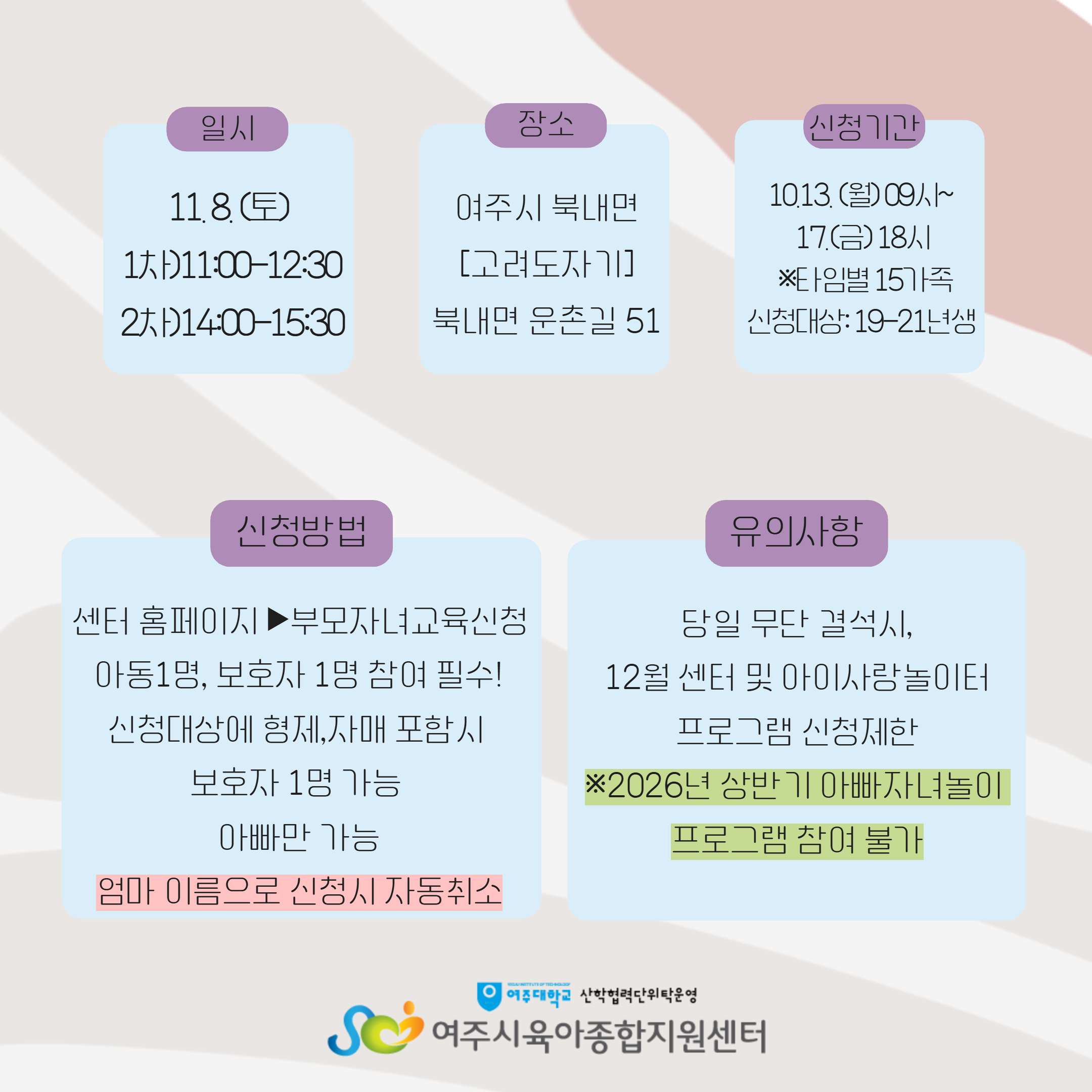 | ±âŸ»çÇ× | 1.¿øÈ°ÇÑ ÁøÇàÀ» À§ÇØ ½Ã°£À» ²À ÁöÄÑÁÖ¼¼¿ä. 2.´çÀÏ °á¼® ½Ã Áõºù¼·ù Á¦Ã⠽ÿ¡¸¸ ÆÐ³ÎƼ°¡ ¾ø½À´Ï´Ù. 3.½ÅûÀº ¾Æ¹ö´Ô ¼ºÇÔÀ¸·Î ÇØÁÖ¼¼¿ä. 4.´çÀÏ °á¼®½Ã 12¿ù ¼¾ÅÍ ¹× ¾ÆÀÌ»ç¶û ³îÀÌÅÍ ÇÁ·Î±×·¥ ½ÅûÁ¦ÇÑ ¹× 2026³â »ó¹Ý±â ¾ÆºüÀÚ³à³îÀÌ ÇÁ·Î±×·¥ ½Åû¿¡ Á¦ÇÑÀÌ ÀÖ½À´Ï´Ù. 5.´Üü º¸Çè °¡ÀÔÀ» À§ÇØ ¼øÂ÷ÀûÀ¸·Î ¿¬¶ô µå¸³´Ï´Ù. |
