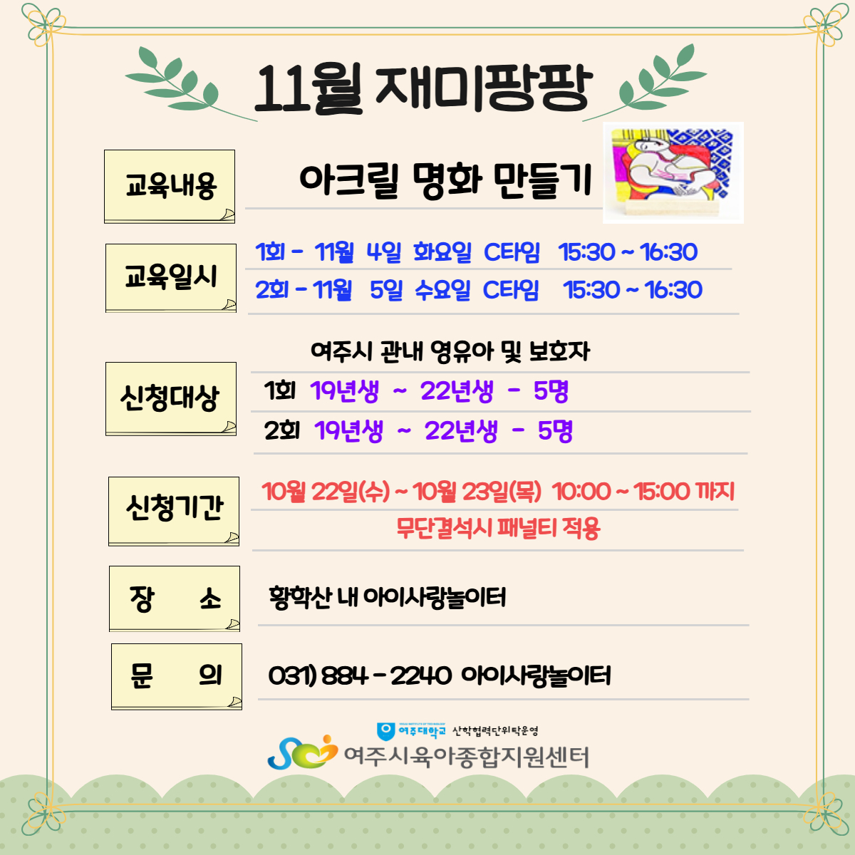 | ±âŸ»çÇ× | Áغñ¹° : 3°³¿ù ÀÌÀü µîº» Çʼö *Ãë¼Ò½Ã ¹Ýµå½Ã ÀüÈ ¿¬¶ôÀ» ÁÖ¼Å¾ß ÇÕ´Ï´Ù. * °á¼®½Ã ÅëÇÕÆÐ³ÎÆ¼ Àû¿ë (´ÙÀ½´Þ ÇÑ´Þ°£ ¾ÆÀÌ»ç¶û³îÀÌÅÍ& ¼¾ÅÍ ÇÁ·Î±×·¥ ½ÅûÁ¦ÇÑ) *½ÅûµÇ½Å ȸ¿øÀº È®Á¤ ¾È³» ¹®ÀÚ¸¦ µå¸³´Ï´Ù. *1°¡Á¤´ç ¾Æµ¿ 1¸í¸¸ ½Åû°¡´É(½ÖµÕÀÌ´Â ¿¹¿Ü ¹Ýµå½Ã º¸È£ÀÚ´Â °¢°¢ ¿À¼Å¾ß ÇÕ´Ï´Ù) ´ë±â·Î µî·ÏµÈ ºÐÀº ½Åû¿Ï·áÀÚ°¡ Ãë¼Ò½Ã ´çÀÏÀÌ¶óµµ ¿¬¶ôÀ» µå¸³´Ï´Ù. * ´ë±â½ÅûÀÚ¿¡°Ô ¿¬¶ô ÈÄ ºÎÀçÁ߽à 30ºÐÀ̳» ¿¬¶ôÀÌ ¾øÀ¸¸é ´ÙÀ½ ´ë±âÀÚ¿¡°Ô ±âȸ´Â ³Ñ¾î°¨ (´ë±âÀÚ¿¡°Ô º°µµÀÇ ¹®ÀÚ ¾È³»´Â ÇÏÁö ¾Ê½À´Ï´Ù.) |