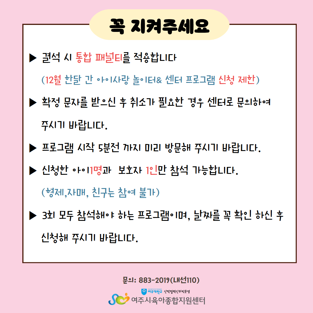 | ±âŸ»çÇ× | - ÁÖÂ÷ÀåÀÌ Çù¼ÒÇÏ¿À´Ï 5ºÐÀü±îÁö µµÂøÇÏ¿© Ȱµ¿ ½Ã°£¿¡ ´ÊÁö ¾Êµµ·Ï ÁÖÀǹٶø´Ï´Ù. (¼¾ÅÍ ¿· °Ç¹° °ø¿ëÁÖÂ÷Àå 1½Ã°£ ¹«·á ÁøÇàÀ̹ǷΠÁÖÂ÷ÀåÀÌ Çù¼ÒÇÒ °æ¿ì ÀÌ¿ëÇϽñ⠹ٶø´Ï´Ù.) - º» ÇÁ·Î±×·¥Àº ½ÅûÇÑ ¾ÆÀÌ1¸í°ú º¸È£ÀÚ 1Àθ¸ Âü¼®°¡´ÉÇÕ´Ï´Ù.(ÇüÁ¦,ÀڸŠÂü¿©ºÒ°¡) - ÇÁ·Î±×·¥ ´çÀÏ °á¼® ½Ã ÅëÇÕÆÐ³ÎÆ¼°¡ Àû¿ëµÇ´Ï À¯ÀÇÇØÁÖ¼¼¿ä (25³â 12¿ù ÇÑ´Þ °£ ¾ÆÀÌ»ç¶û ³îÀÌÅÍ& ¼¾ÅÍ ÇÁ·Î±×·¥ ½ÅûÁ¦ÇÑ) - °á¼® ½Ã Áõºù¼·ù¸¦ ²À ÁöÂüÇØ ÁÖ¼Å¾ß Çϸç Ãë¼Ò³ª °á¼®½Ã ´ã´çÀÚ¿¡°Ô ¿¬¶ôÁֽñ⠹ٶø´Ï´Ù. - ´ë±âÀÚ´Â ½Åû ¼øÀ¸·Î ¿¬¶ôµå¸®¸ç ºÎÀçÁß ½Ã ´ÙÀ½ ´ë±âÀÚ¿¡°Ô ¿¬¶ôµå¸³´Ï´Ù. - ´Ùȸ±â ÇÁ·Î±×·¥À¸·Î ÀÏÁ¤ È®ÀÎ ÈÄ Âü¿©°¡ ¸ðµÎ °¡´ÉÇϽаæ¿ì¿¡¸¸ ½ÅÃ»ÇØÁֽñ⠹ٶø´Ï´Ù. |