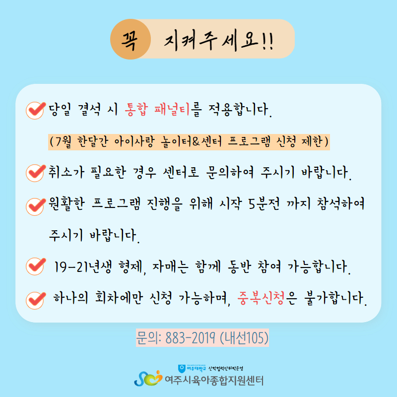 | ±âŸ»çÇ× | - ÁÖÂ÷ÀåÀÌ Çù¼ÒÇÏ¿À´Ï 5ºÐÀü±îÁö µµÂøÇÏ¿© Ȱµ¿ ½Ã°£¿¡ ´ÊÁö ¾Êµµ·Ï ÁÖÀǹٶø´Ï´Ù. - º» ÇÁ·Î±×·¥Àº 19-21³â»ý¿¡ ÇØ´çÇÏ´Â ÇüÁ¦,ÀڸŴ µ¿¹Ý Âü¿©°¡ °¡´ÉÇÕ´Ï´Ù. - ÇÁ·Î±×·¥ ´çÀÏ °á¼® ½Ã ÅëÇÕÆÐ³ÎÆ¼°¡ Àû¿ëµÇ´Ï À¯ÀÇÇØÁÖ¼¼¿ä (25³â 7¿ù ÇÑ´Þ °£ ¾ÆÀÌ»ç¶û ³îÀÌÅÍ& ¼¾ÅÍ ÇÁ·Î±×·¥ ½ÅûÁ¦ÇÑ) - °á¼® ½Ã Áõºù¼·ù¸¦ ²À ÁöÂüÇØ ÁÖ¼Å¾ß Çϸç Ãë¼Ò³ª °á¼®½Ã ´ã´çÀÚ¿¡°Ô ¿¬¶ôÁֽñ⠹ٶø´Ï´Ù. - ´ë±âÀÚ´Â ½Åû ¼øÀ¸·Î ¿¬¶ôµå¸®¸ç ºÎÀçÁß ½Ã ´ÙÀ½ ´ë±âÀÚ¿¡°Ô ¿¬¶ôµå¸³´Ï´Ù. - 1,2,3ȸ °°Àº ÁÖÁ¦·Î ÁøÇàµÇ¿À´Ï Áߺ¹ ½ÅûÀº ºÒ°¡ÇÕ´Ï´Ù. |