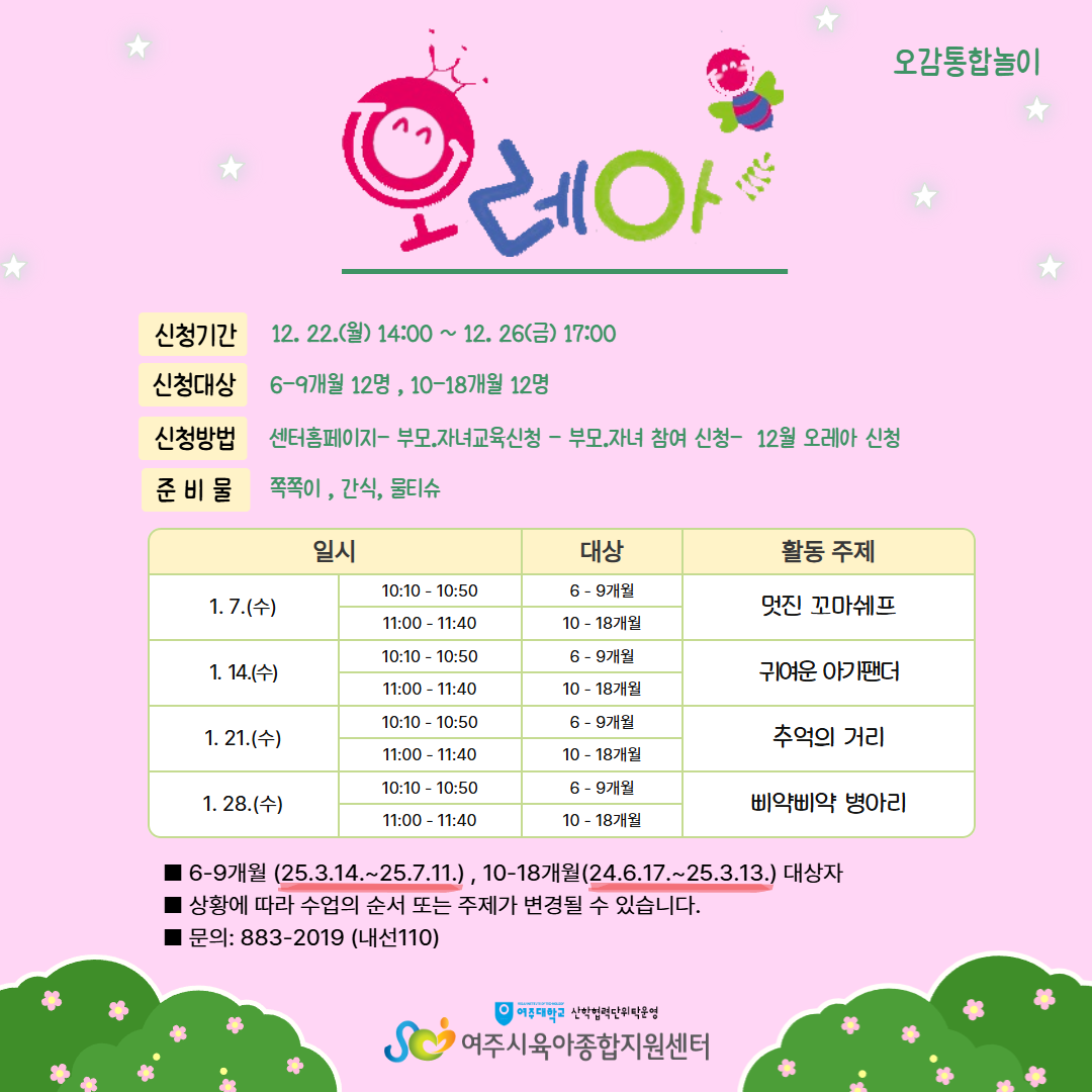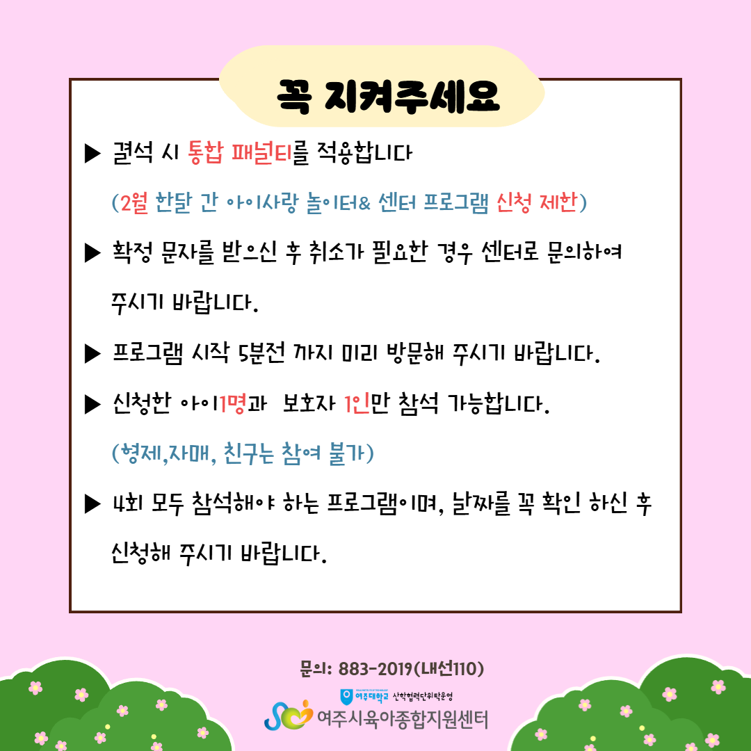 | ±âŸ»çÇ× | - ÁÖÂ÷ÀåÀÌ Çù¼ÒÇÏ¿À´Ï 5ºÐÀü±îÁö µµÂøÇÏ¿© Ȱµ¿ ½Ã°£¿¡ ´ÊÁö ¾Êµµ·Ï ÁÖÀǹٶø´Ï´Ù. (¼¾ÅÍ ¿· °Ç¹° °ø¿ëÁÖÂ÷Àå 1½Ã°£ ¹«·á ÁøÇàÀ̹ǷΠÁÖÂ÷ÀåÀÌ Çù¼ÒÇÒ °æ¿ì ÀÌ¿ëÇϽñ⠹ٶø´Ï´Ù.) - º» ÇÁ·Î±×·¥Àº ½ÅûÇÑ ¾ÆÀÌ1¸í°ú º¸È£ÀÚ 1Àθ¸ Âü¼®°¡´ÉÇÕ´Ï´Ù.(ÇüÁ¦,ÀڸŠÂü¿©ºÒ°¡) - ÇÁ·Î±×·¥ ´çÀÏ °á¼® ½Ã ÅëÇÕÆÐ³ÎÆ¼°¡ Àû¿ëµÇ´Ï À¯ÀÇÇØÁÖ¼¼¿ä (26³â 2¿ù ÇÑ´Þ °£ ¾ÆÀÌ»ç¶û ³îÀÌÅÍ& ¼¾ÅÍ ÇÁ·Î±×·¥ ½ÅûÁ¦ÇÑ) - °á¼® ½Ã Áõºù¼·ù¸¦ ²À ÁöÂüÇØ ÁÖ¼Å¾ß Çϸç Ãë¼Ò³ª °á¼®½Ã ´ã´çÀÚ¿¡°Ô ¿¬¶ôÁֽñ⠹ٶø´Ï´Ù. - ´ë±âÀÚ´Â ½Åû ¼øÀ¸·Î ¿¬¶ôµå¸®¸ç ºÎÀçÁß ½Ã ´ÙÀ½ ´ë±âÀÚ¿¡°Ô ¿¬¶ôµå¸³´Ï´Ù. - ´Ùȸ±â ÇÁ·Î±×·¥À¸·Î ÀÏÁ¤ È®ÀÎ ÈÄ Âü¿©°¡ ¸ðµÎ °¡´ÉÇϽаæ¿ì¿¡¸¸ ½ÅÃ»ÇØÁֽñ⠹ٶø´Ï´Ù. |