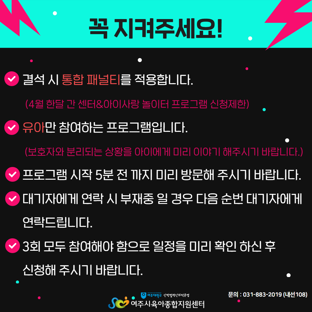 | ±âŸ»çÇ× | - ÁÖÂ÷ÀåÀÌ Çù¼ÒÇÏ¿À´Ï 5ºÐÀü±îÁö µµÂøÇÏ¿© Ȱµ¿ ½Ã°£¿¡ ´ÊÁö ¾Êµµ·Ï ÁÖÀǹٶø´Ï´Ù. <¼¾ÅÍ ÁÖÂ÷Àå ¸¸Â÷ ½Ã ¼¾ÅÍ ¿· ¿©Èﵿ °ø¿ë ÁÖÂ÷Àå ÀÌ¿ë. (µµº¸ 1ºÐ ¼Ò¿ä) / ÃÖÃÊ 60ºÐ ¹«·á, 60ºÐ Ãʰú ½Ã 10ºÐ´ç 200¿ø, ÀÏÀÏ ÃÖ´ë 6,000¿ø> - ¼ö¾÷ 3ȸ ¸ðµÎ Âü¿©ÇØ¾ß ÇÏ´Â ÇÁ·Î±×·¥ÀÔ´Ï´Ù. - º» ÇÁ·Î±×·¥Àº ¾ÆÀ̸¸ Âü¿©ÇÏ´Â ºÐ¸® ¼ö¾÷ÀÔ´Ï´Ù. - ÇÁ·Î±×·¥ ´çÀÏ °á¼® ½Ã ÅëÇÕÆÐ³ÎÆ¼°¡ Àû¿ëµÇ´Ï À¯ÀÇÇØÁÖ¼¼¿ä (4¿ù ÇÑ´Þ °£ ¾ÆÀÌ»ç¶û ³îÀÌÅÍ& ¼¾ÅÍ ÇÁ·Î±×·¥ ½ÅûÁ¦ÇÑ) - °á¼® ½Ã Áõºù¼·ù¸¦ ²À ÁöÂüÇØ ÁÖ¼Å¾ß Çϸç Ãë¼Ò³ª °á¼®½Ã ´ã´çÀÚ¿¡°Ô ¿¬¶ôÁֽñ⠹ٶø´Ï´Ù. - ´ë±âÀÚ´Â ½Åû ¼øÀ¸·Î ¿¬¶ôµå¸®¸ç ºÎÀçÁß ½Ã ´ÙÀ½ ´ë±âÀÚ¿¡°Ô ¿¬¶ôµå¸³´Ï´Ù. - ´Ùȸ±â ÇÁ·Î±×·¥À¸·Î ÀÏÁ¤ È®ÀÎ ÈÄ Âü¿©°¡ ¸ðµÎ °¡´ÉÇϽаæ¿ì¿¡¸¸ ½ÅÃ»ÇØÁֽñ⠹ٶø´Ï´Ù. |