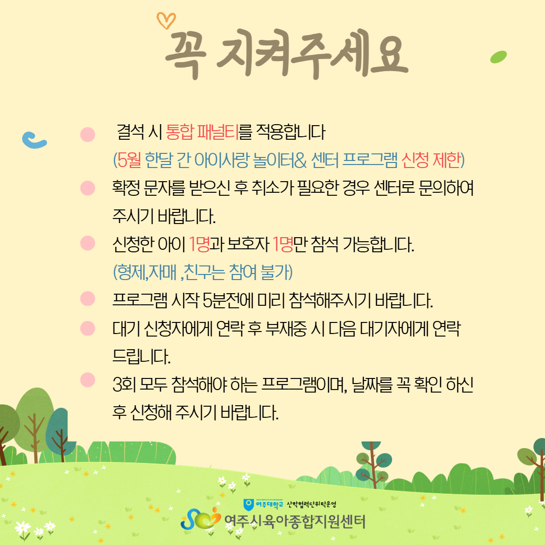 | ±âŸ»çÇ× | - ÁÖÂ÷ÀåÀÌ Çù¼ÒÇÏ¿À´Ï 5ºÐÀü±îÁö µµÂøÇÏ¿© Ȱµ¿ ½Ã°£¿¡ ´ÊÁö ¾Êµµ·Ï ÁÖÀǹٶø´Ï´Ù. - º» ÇÁ·Î±×·¥Àº ½ÅûÇÑ ¾ÆÀÌ1¸í°ú º¸È£ÀÚ 1Àθ¸ Âü¼®°¡´ÉÇÕ´Ï´Ù.(ÇüÁ¦,ÀڸŠÂü¿©ºÒ°¡) - ÇÁ·Î±×·¥ ´çÀÏ °á¼® ½Ã ÅëÇÕÆÐ³ÎÆ¼°¡ Àû¿ëµÇ´Ï À¯ÀÇÇØÁÖ¼¼¿ä (26³â 5¿ù ÇÑ´Þ °£ ¾ÆÀÌ»ç¶û ³îÀÌÅÍ& ¼¾ÅÍ ÇÁ·Î±×·¥ ½ÅûÁ¦ÇÑ) - °á¼® ½Ã Áõºù¼·ù¸¦ ²À ÁöÂüÇØ ÁÖ¼Å¾ß Çϸç Ãë¼Ò³ª °á¼®½Ã ´ã´çÀÚ¿¡°Ô ¿¬¶ôÁֽñ⠹ٶø´Ï´Ù. - ´ë±âÀÚ´Â ½Åû ¼øÀ¸·Î ¿¬¶ôµå¸®¸ç ºÎÀçÁß ½Ã ´ÙÀ½ ´ë±âÀÚ¿¡°Ô ¿¬¶ôµå¸³´Ï´Ù. - 3ȸ ¸ðµÎ Âü¼®ÇÏ¼Å¾ß ÇÕ´Ï´Ù. |