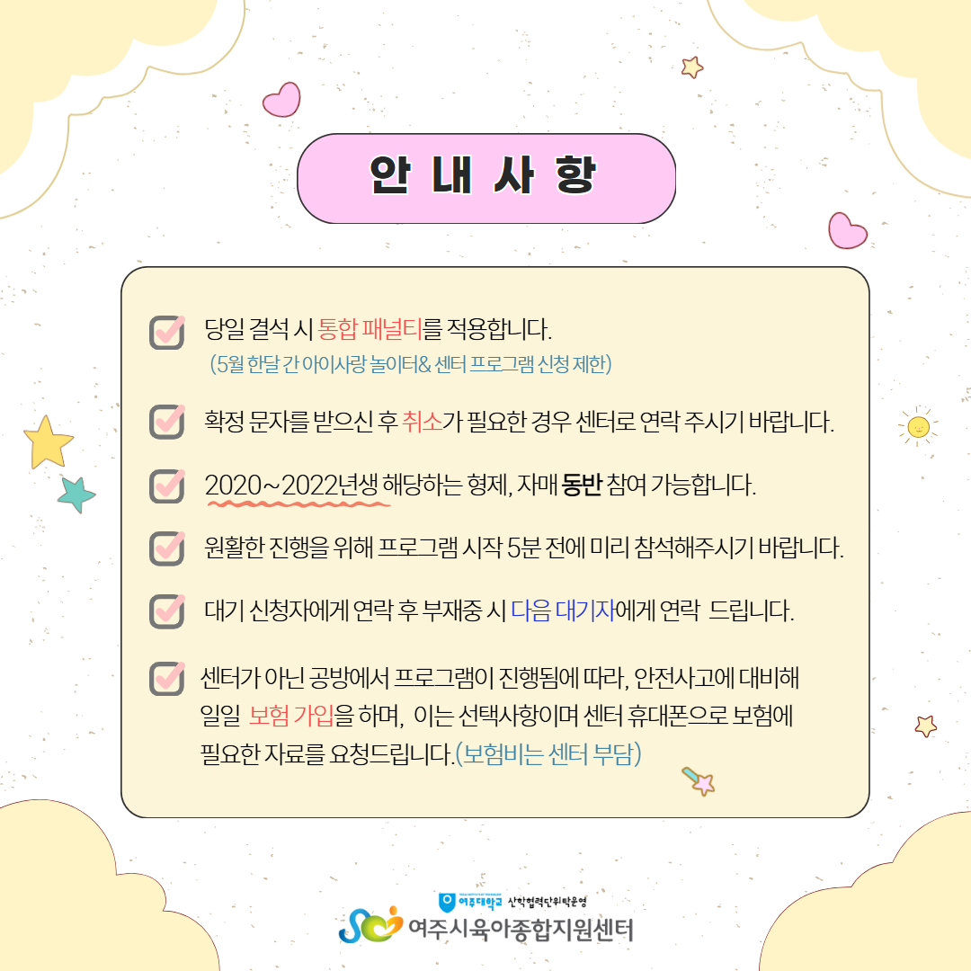 | ±âŸ»çÇ× | - ÇÁ·Î±×·¥ÀÌ ÁøÇàµÇ´Â Àå¼Ò¸¦ ²À »çÀü¿¡ È®ÀÎÇØ Áֽñ⠹ٶø´Ï´Ù. - °á¼® ½Ã Áõºù¼·ù¸¦ ²À Á¦ÃâÇØ ÁÖ¼Å¾ß Çϸç Ãë¼Ò³ª °á¼® ½Ã ´ã´çÀÚ¿¡°Ô ¿¬¶ôÁֽñ⠹ٶø´Ï´Ù. - ´ë±âÀÚ´Â ½Åû ¼øÀ¸·Î ¿¬¶ôµå¸®¸ç ºÎÀçÁß ½Ã ´ÙÀ½ ´ë±âÀÚ¿¡°Ô ¿¬¶ôµå¸³´Ï´Ù. |