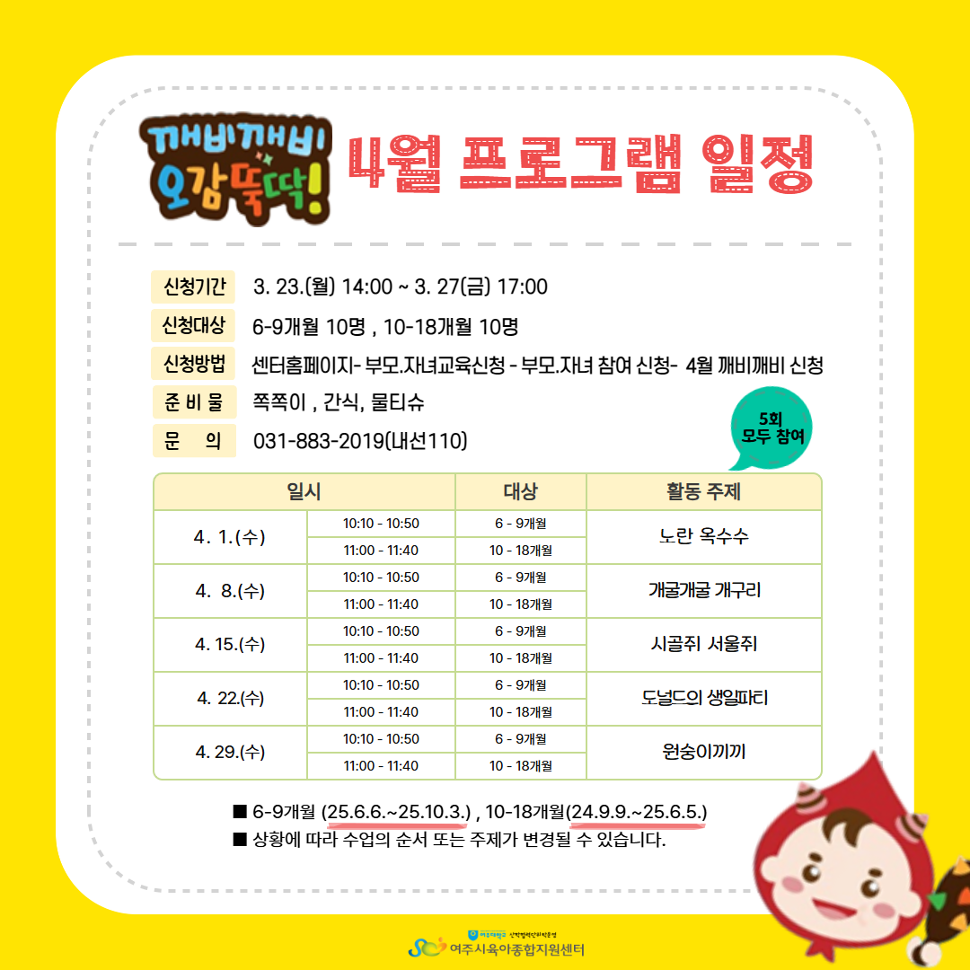 | (6-9°³¿ù) ±úºñ±úºñ ¿À°¨¶Òµü 2026³â 4.1/ 8/ 15/22/29(¼ö) | |||
