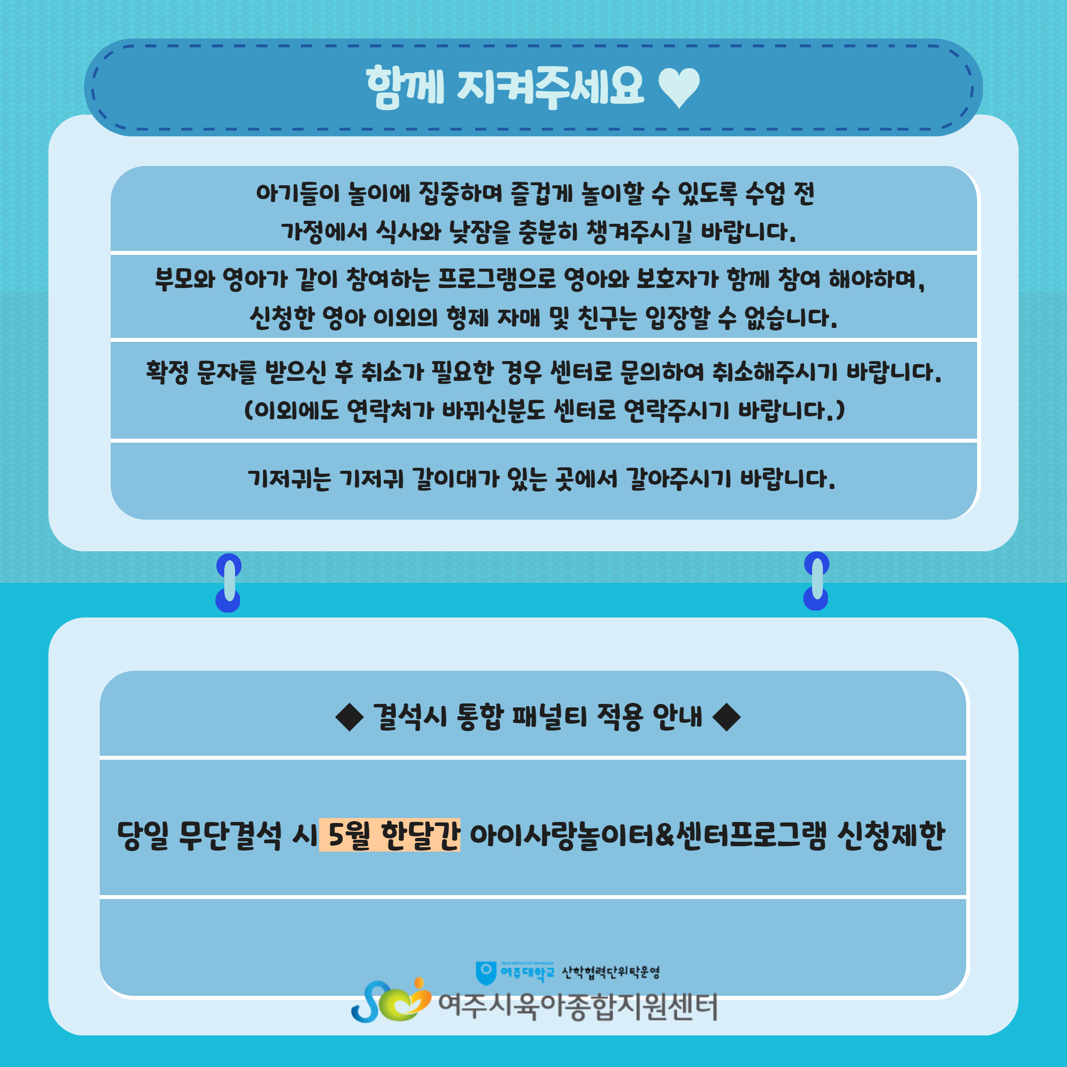 | ±âŸ»çÇ× | ¡Ú¹Ýµå½Ã ¿µ¾Æ 1ÀÎ º¸È£ÀÚ 1ÀÎ Âü¿© -ÇÁ·Î±×·¥ ´çÀÏ Ãë¼Ò³ª °á¼®Àº ´ÙÀ½´Þ ÇÁ·Î±×·¥ À̿뿡 Á¦ÇÑÀÌ µÉ¼ö ÀÖÀ¸´Ï Âü°íÇϽñ⠹ٶø´Ï´Ù. ¡ÚÁÖÂ÷Àå ÀÌ¿ë ¾È³»¡Ú - ¼¾ÅÍ ÁÖÂ÷Àå ¸¸Â÷½Ã ¼¾ÅÍ ¿· ¿©Èﵿ °ø¿µ ÁÖÂ÷Àå ÀÌ¿ë (µµº¸ 1ºÐ ¼Ò¿ä) - ÃÖÃÊ 60ºÐ ¹«·á, 60ºÐ Ãʰú½Ã 10ºÐ´ç 200¿ø - ÀÏÀÏ ÃÖ´ë 6,000¿ø ¼¾ÅÍ ÁÖÂ÷ÀåÀÌ Çù¼ÒÇÏ´Ï, ¾çÇØ ¹Ù¶ø´Ï´Ù. |
