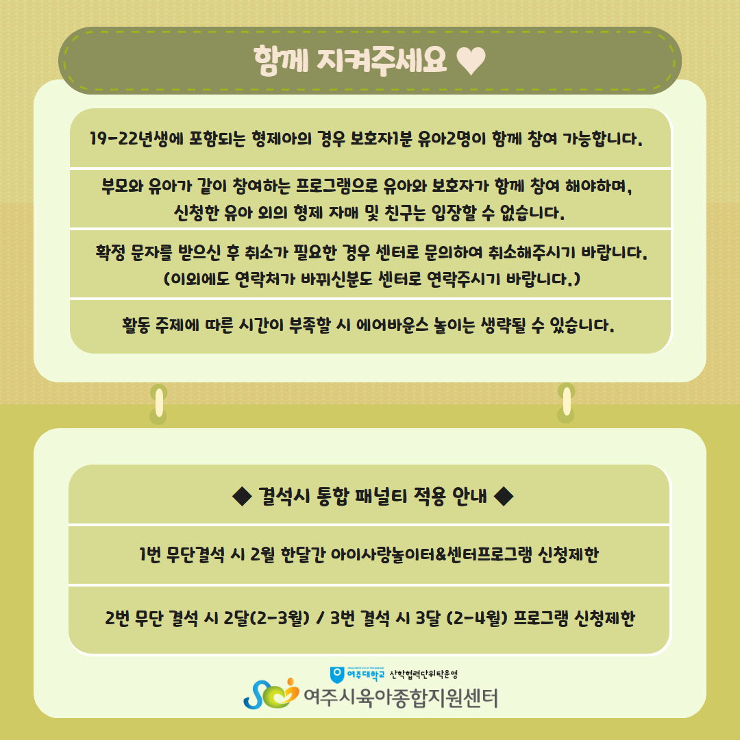| ±âŸ»çÇ× | ¡Ú¹Ýµå½Ã À¯¾Æ 1ÀÎ º¸È£ÀÚ 1ÀÎ Âü¿©À̸ç ÇüÁ¦¾Æ´Â º¸È£ÀÚ 1Àεµ °¡´É. -ÇÁ·Î±×·¥ ´çÀÏ Ãë¼Ò³ª °á¼®Àº ´ÙÀ½´Þ ÇÁ·Î±×·¥ À̿뿡 Á¦ÇÑÀÌ µÉ¼ö ÀÖÀ¸´Ï Âü°íÇϽñ⠹ٶø´Ï´Ù. ¡ÚÁÖÂ÷Àå ÀÌ¿ë ¾È³»¡Ú - ¼¾ÅÍ ÁÖÂ÷Àå ¸¸Â÷½Ã ¼¾ÅÍ ¿· ¿©Èﵿ °ø¿µ ÁÖÂ÷Àå ÀÌ¿ë (µµº¸ 1ºÐ ¼Ò¿ä) - ÃÖÃÊ 60ºÐ ¹«·á, 60ºÐ Ãʰú½Ã 10ºÐ´ç 200¿ø - ÀÏÀÏ ÃÖ´ë 6,000¿ø ¼¾ÅÍ ÁÖÂ÷ÀåÀÌ Çù¼ÒÇÏ´Ï, ¾çÇØ ¹Ù¶ø´Ï´Ù. |