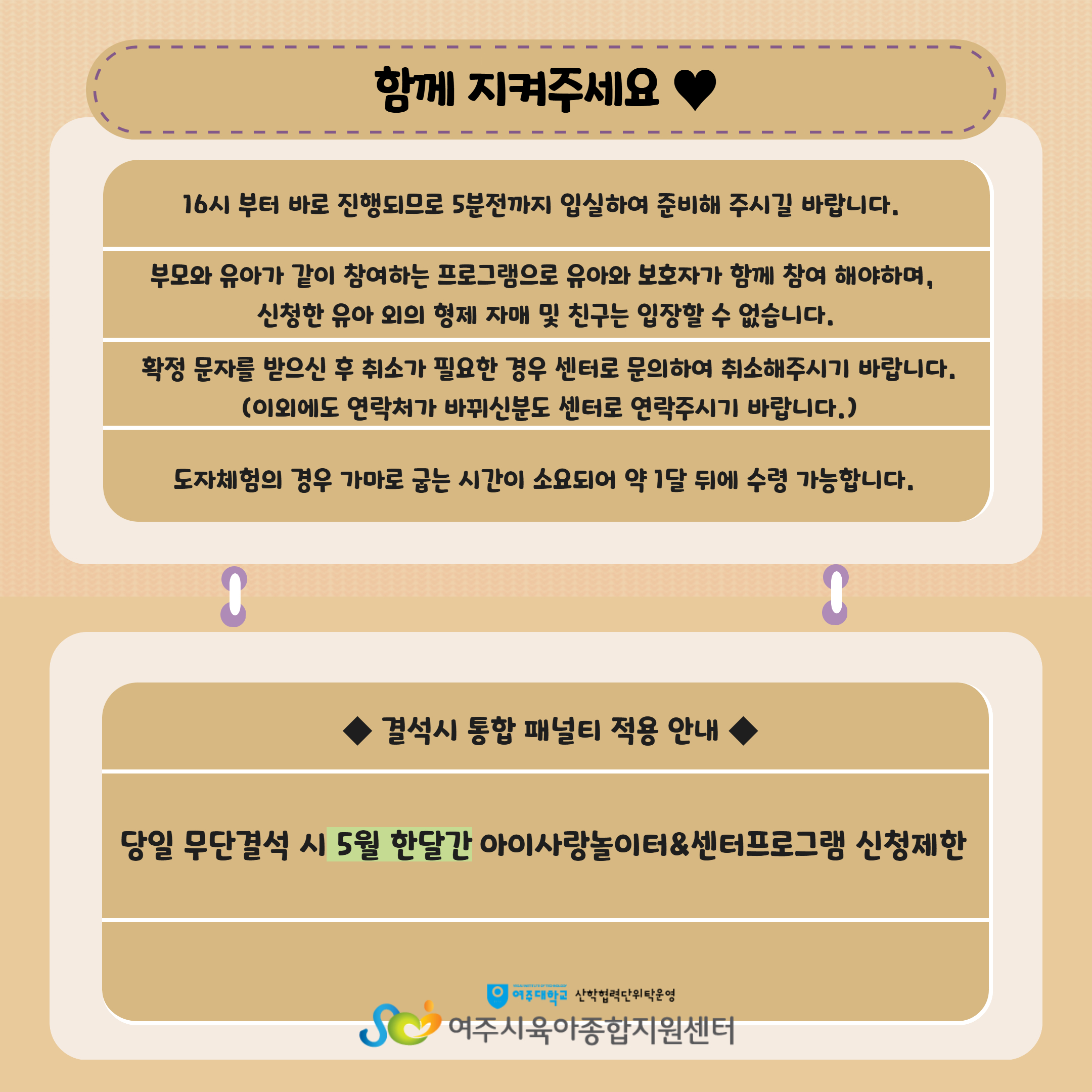 | ±âŸ»çÇ× | ¡Ú¹Ýµå½Ã À¯¾Æ 1ÀÎ º¸È£ÀÚ 1ÀÎ Âü¿© -ÇÁ·Î±×·¥ ´çÀÏ Ãë¼Ò³ª °á¼®Àº ´ÙÀ½´Þ ÇÁ·Î±×·¥ À̿뿡 Á¦ÇÑÀÌ µÉ¼ö ÀÖÀ¸´Ï Âü°íÇϽñ⠹ٶø´Ï´Ù. ¡ÚÁÖÂ÷Àå ÀÌ¿ë ¾È³»¡Ú - ¼¾ÅÍ ÁÖÂ÷Àå ¸¸Â÷½Ã ¼¾ÅÍ ¿· ¿©Èﵿ °ø¿µ ÁÖÂ÷Àå ÀÌ¿ë (µµº¸ 1ºÐ ¼Ò¿ä) - ÃÖÃÊ 60ºÐ ¹«·á, 60ºÐ Ãʰú½Ã 10ºÐ´ç 200¿ø - ÀÏÀÏ ÃÖ´ë 6,000¿ø ¼¾ÅÍ ÁÖÂ÷ÀåÀÌ Çù¼ÒÇÏ´Ï, ¾çÇØ ¹Ù¶ø´Ï´Ù. |